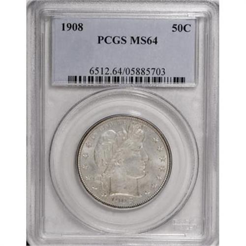 <B>1908 50C MS64 PCGS.</B></I> A brilliant satin near-Gem that could arguably qualify for a higher grade. Both sides have satiny silver luster with full mint bloom. A few faint splashes of gold and iridescent toning are visible on the reverse. Population: 41 in 64, 22 finer (1/08).<BR><BR><B>Coin Engraver:</B> Charles E. Barber<BR><BR><b>Shipping:</b> Coins & Currency (<a target="_blank" href="http://www.heritageauctions.com/common/shipping.php">view shipping information</a>)