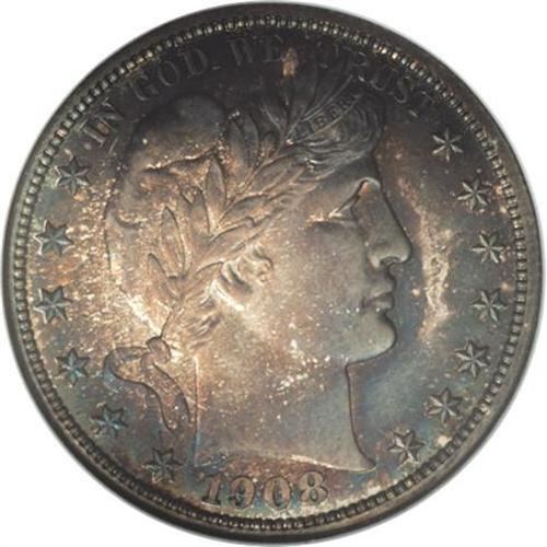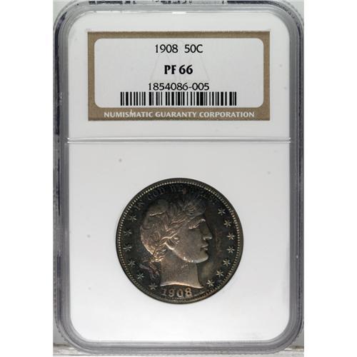 <B>1908 50C PR66 NGC.</B></I> Just 545 proof half dollars were struck in 1908. The Premium Gem specimen offered in this lot displays a pleasing mixture of brilliance and deep cobalt-blue, lavender, and golden-brown toning on each side, along with a well executed strike that has left crisp impressions on the design elements. Well preserved surfaces complement those attributes. Census: 19 in 66, 15 finer (3/07).<BR><BR><b>Shipping:</b> Coins & Currency (<a target="_blank" href="http://www.heritageauctions.com/common/shipping.php">view shipping information</a>)