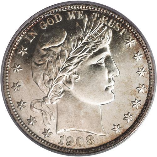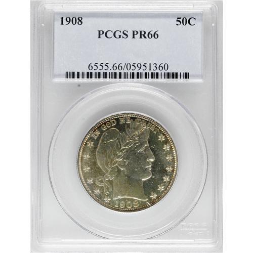 <B>1908 50C PR66 PCGS.</B></I> Light amber-gold and pinkish toning coats each side of this pretty Premium Gem. Both sides show considerable reflectivity, and only a couple of trivial slide marks on the cheek likely keep this sharp coin from an even finer grade. A nice piece for the PR66 rank. Population: 8 in 66, 10 finer (4/07).<BR><BR><b>Shipping:</b> Coins & Currency (<a target="_blank" href="http://www.heritageauctions.com/common/shipping.php">view shipping information</a>)