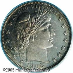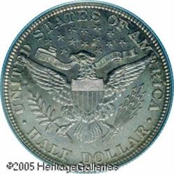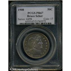 <B>1908 50C PR67 PCGS.</B></I> Medium golden-brown, olive, and mauve patina embraces this lovingly preserved Superb Gem. The strike is refreshingly bold, since even the right (facing) claw and shield corner offer impressive definition. A scant 545 proofs were struck, the lowest mintage of the series aside from the 1915. Population: 8 in 67, 3 finer (1/05).<BR><I>From the Bruce Scher #1 All-Time PCGS Registry Set.</B></I> Lot:4124
