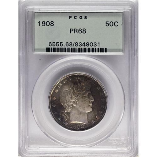 <B>1908 50C PR68 PCGS.</B></I> Splashes of gold-orange, lavender, and electric-blue leave a portion of the obverse brilliant, and powder-blue and lilac occupy the reverse of this lovely PR68 half dollar. The design elements are exquisitely struck, and impeccably preserved surfaces are virtually unimprovable. Housed in a green label holder. Population: 3 in 68, 0 finer (3/07).<BR><BR><b>Shipping:</b> Coins & Currency (<a target="_blank" href="http://www.heritageauctions.com/common/shipping.php">view shipping information</a>) <BR><BR><B>Importan