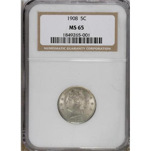 <B>1908 5C MS65 NGC.</B></I> NGC Census: (48/8). PCGS Population (69/11). Mintage: 22,686,176. Numismedia Wsl. Price for NGC/PCGS coin in MS65: $890. (#3869)<BR><BR><b>Shipping:</b> Coins & Currency (<a target="_blank" href="http://www.heritageauctions.com/common/shipping.php">view shipping information</a>)