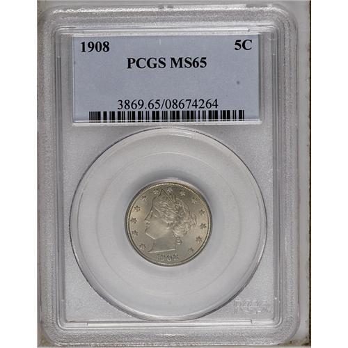 <B>1908<5C> MS65 PCGS.</B></I> This light golden-tan and steel-blue Gem is outstanding from a technical perspective, since there is virtually no indication of contact. The strike is blunt on a few stars, and on the left (facing) ear of corn. Population: 62 in 65, 6 finer (7/06).