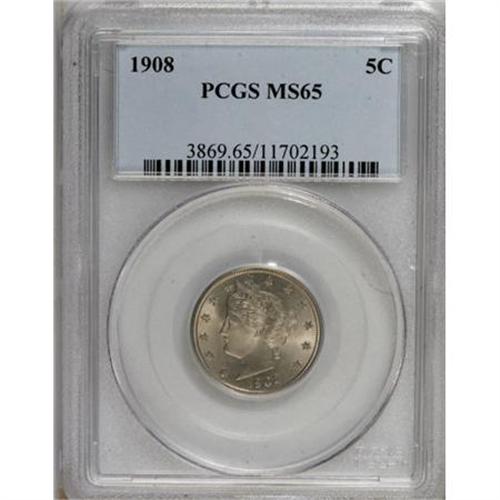 <B>1908 5C MS65 PCGS.</B></I> This satiny nickel-gray Gem displays subtle sea-green overtones in the fields. While the portrait shows strong detail, the stars and lower wreath are soft. Still, a carefully preserved example of this later Liberty issue. Population: 72 in 65, 11 finer (8/07).<BR><BR><B>Coin Engraver:</B> Charles E. Barber<BR><BR><b>Shipping:</b> Coins & Currency (<a target="_blank" href="http://www.heritageauctions.com/common/shipping.php">view shipping information</a>)