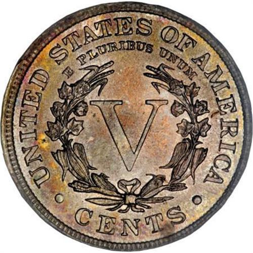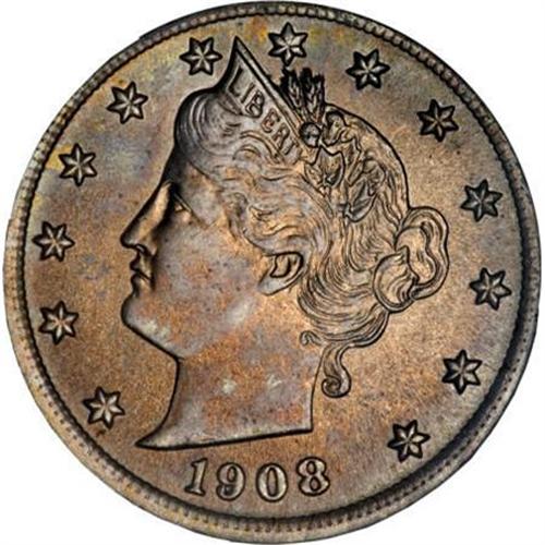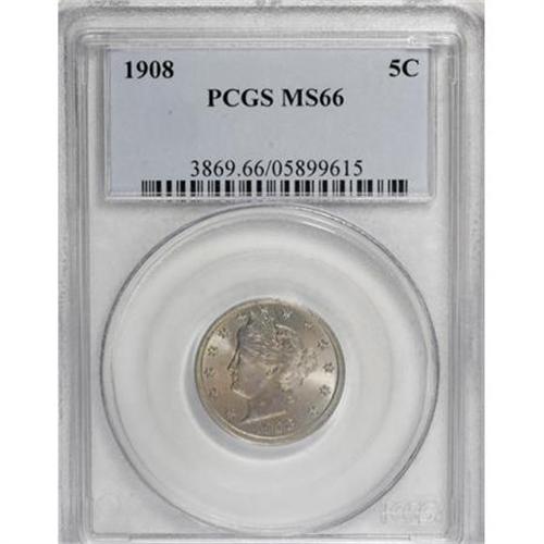 <B>1908 5C MS66 PCGS.</B></I> A Premium Gem, featuring shimmering luster and a good strike that clearly delineates each detail. Light shades of olive, lavender, and gold rest on the very clean surfaces that appear unmarked to the unaided eye. This issue is virtually never encountered any finer than this. Population: 12 in 66, 0 finer (12/07).<BR><BR><B>Coin Engraver:</B> Charles E. Barber<BR><BR><b>Shipping:</b> Coins & Currency (<a target="_blank" href="http://www.heritageauctions.com/common/shipping.php">view shipping information</a>)