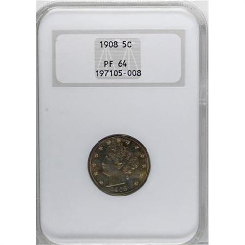 <B>1908 5C PR64 NGC.</B></I> NGC Census: (126/181). PCGS Population (155/130). Mintage: 1,620. Numismedia Wsl. Price for NGC/PCGS coin in PR64: $240. (#3906)<BR><BR><B>Coin Engraver:</B> Charles E. Barber<BR><BR><b>Shipping:</b> Coins & Currency (<a target="_blank" href="http://www.heritageauctions.com/common/shipping.php">view shipping information</a>)