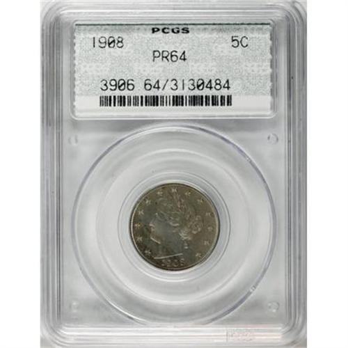 <B>1908 5C PR64 PCGS.</B></I> PCGS Population (160/132). NGC Census: (129/188). Mintage: 1,620. Numismedia Wsl. Price for NGC/PCGS coin in PR64: $240. (#3906)<BR><BR><B>Coin Engraver:</B> Charles E. Barber<BR><BR><b>Shipping:</b> Coins & Currency (<a target="_blank" href="http://www.heritageauctions.com/common/shipping.php">view shipping information</a>)