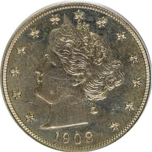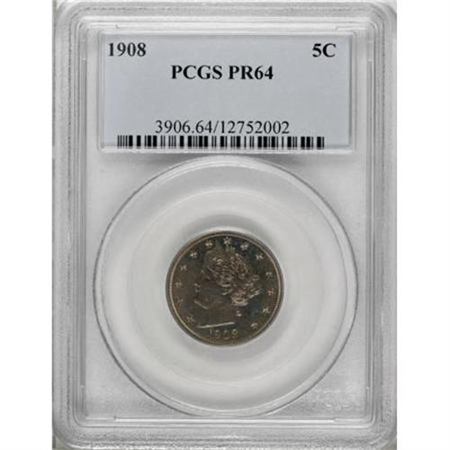 <B>1908 5C PR64 PCGS.</B></I> PCGS Population (160/132). NGC Census: (129/188). Mintage: 1,620. Numismedia Wsl. Price for NGC/PCGS coin in PR64: $240. (#3906)<BR><BR><B>Coin Engraver:</B> Charles E. Barber<BR><BR><b>Shipping:</b> Coins & Currency (<a target="_blank" href="http://www.heritageauctions.com/common/shipping.php">view shipping information</a>)