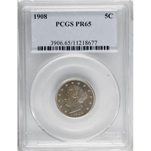 <B>1908 5C PR65 PCGS.</B></I> PCGS Population (95/35). NGC Census: (101/77). Mintage: 1,620. Numismedia Wsl. Price for NGC/PCGS coin in PR65: $484. (#3906)<BR><BR><B>Coin Engraver:</B> Charles E. Barber<BR><BR><b>Shipping:</b> Coins & Currency (<a target="_blank" href="http://www.heritageauctions.com/common/shipping.php">view shipping information</a>\)