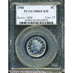 <B>1908<5C> PR66 Cameo PCGS.</B></I> A lovely untoned white on black cameo contrast. The design elements are razor sharp, and pristine surfaces are virtually devoid of blemishes. A super coin! Population: 5 in 66, 3 finer (9/04). <BR><BR><B>Important notice:</B> Heritage usually auctions material at the rate of 200-250 lots per hour. On some occasions eBay Live bid software or the Internet may not be able to keep up with the pace of the auction. We recommend placing a realistic absentee bid now as insurance to avoid disappointment. Occasionally the auctioneer may eliminate or reject an eBay Live bid, and the auctioneer may also reopen a lot after the close of the eBay live bidding (usually because we missed an audience bid), and may reject your bid even if it shows you as the winning bidder. By bidding via eBay Live, you agree that Heritage may award the lot to another bidder at its sole discretion under the circumstances described above or any other reasonable circumstances. Since eBay bids are not shown to us until we open the lot on the floor, we treat those bids just like floor bids. In most cases the floor responds before the eBay bid is presented to us, due to Internet lag time, so for consistency we have made it a policy that floor bids are always considered first over tie eBay live bids. Also please note that all Heritage lots purchased through eBay Live carry a 20% Buyer's Premium. Please make sure you read the Terms and Conditions before you bid.