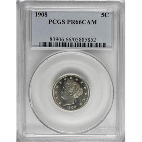 <B>1908 5C PR66 Cameo PCGS.</B></I> Gleaming gold-accented surfaces offer immense reflectivity on this nearly century-old specimen. Decisively struck and delightful, an unusual Cameo representative of this later Liberty issue. Population: 9 in 66 Cameo, 4 finer (12/07).<BR><BR><b>Shipping:</b> Coins & Currency (<a target="_blank" href="http://www.heritageauctions.com/common/shipping.php">view shipping information</a>)