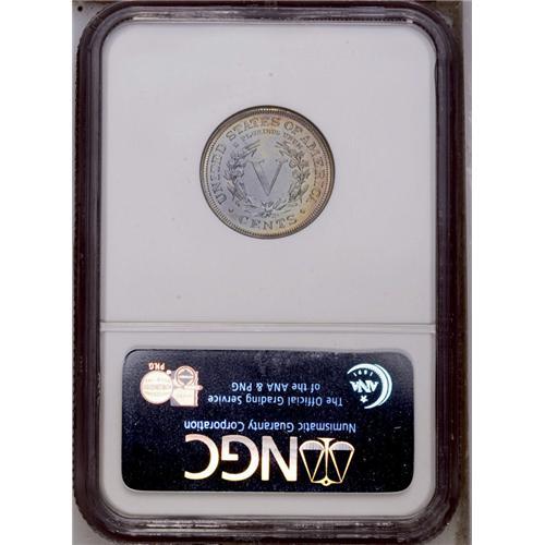 <B>1908<5C> PR66 NGC.</B></I> Pastel powder-blue, lilac, and yellow-gold toning bathes each side of this luminous, well preserved proof. The design elements are well brought up throughout. Census: 52 in 66, 21 finer (3/06). <BR><BR><B>Important notice:</B> Heritage usually auctions material at the rate of 200-250 lots per hour. On some occasions eBay Live bid software or the Internet may not be able to keep up with the pace of the auction. We recommend placing a realistic absentee bid now as insurance to avoid disappointment. Occasionally the auctioneer may eliminate or reject an eBay Live bid, and the auctioneer may also reopen a lot after the close of the eBay live bidding (usually because we missed an audience bid), and may reject your bid even if it shows you as the winning bidder. By bidding via eBay Live, you agree that Heritage may award the lot to another bidder at its sole discretion under the circumstances described above or any other reasonable circumstances. Since eBay bids are not shown to us until we open the lot on the floor, we treat those bids just like floor bids. In most cases the floor responds before the eBay bid is presented to us, due to Internet lag time, so for consistency we have made it a policy that floor bids are always considered first over tie eBay live bids. Also please note that all Heritage lots purchased through eBay Live carry a 20% Buyer's Premium. Please make sure you read the Terms and Conditions before you bid. This lot is being auctioned in conjunction with a live floor auction by Heritage Galleries & Auctioneers. All final auction and invoice information will be supplied by Heritage Galleries & Auctioneers, and all other information should be considered preliminary. Lot:1017 <BR><BR><B>Winning Notification and Billing:</B> After the FINAL session in this auction is complete, Heritage will send e-mail and snail mail invoices. This process normally takes several days. All final auction and invoice information will be supplied by Heritage Galleries & Auctioneers, and all other information should be considered preliminary. <BR><BR>This auction will be conducted on a live auction floor and over the Internet through eBay Live. If you choose to place an absentee bid, please take a moment to <font color='#0000ff'><u><a href='http://pages.ebay.com/liveauctions/help/before/laabsentee.html'>learn how eBay Live absentee bidding works</a></u></font><font color='#000000'>