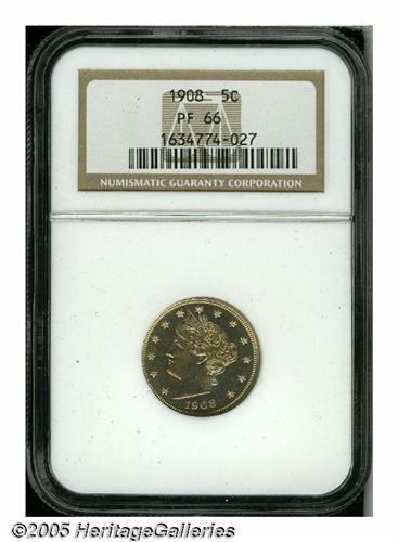 <B>1908<5C> PR66 NGC.</B></I> This flashy Gem has a crisp strike and is nicely preserved. The surfaces are barely toned, and there are no mentionable distractions on either side of the coin. Population: 54 in 66, 20 finer (3/05).