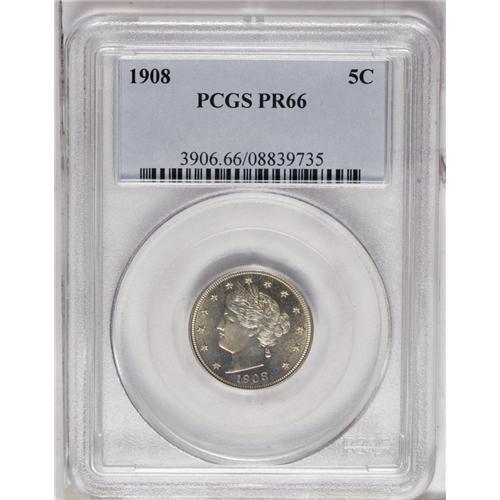 <B>1908<5C> PR66 PCGS.</B></I> An extremely appealing obverse with deep mirrors and lemon-yellow and pink-champagne patina, but a so-so reverse, not quite as well mirrored and with silver-gray color. Still attractive, if a trifle mismatched. Population: 27 in 66, 8 finer (8/06).