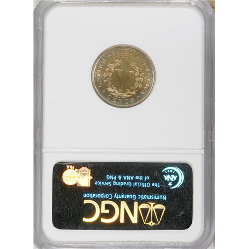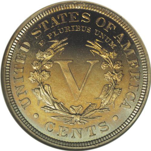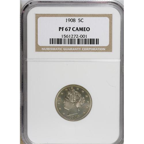 <B>1908 5C PR67 Cameo NGC.</B></I> This amazing proof is tied for the finest Cameo proof example of the date that has been certified by NGC, with no pieces assigned the Ultra Cameo designation. The obverse of this sharply struck beauty has pale gold color while the reverse has deeper gold and iridescent toning. Census: 3 in 67 Cameo, 0 finer (3/07).<BR><BR><b>Shipping:</b> Coins & Currency (<a target="_blank" href="http://www.heritageauctions.com/common/shipping.php">view shipping information</a>)