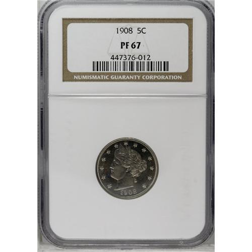 <B>1908<5C> PR67 NGC.</B></I> A medium gray Superb Gem proof with subtle gold toning on each side. The devices have a hint of luster with slight contrast.