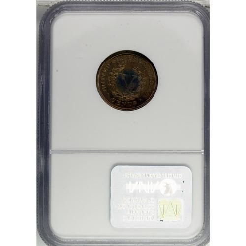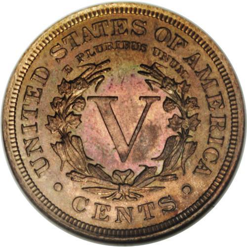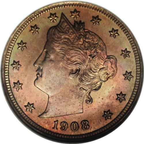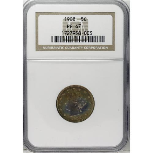 <B>1908 5C PR67 NGC.</B></I> A superlative specimen with rich olive interspersed with glints of lavender-blue and the occasional crimson accent. The strike is needle-sharp, and the only thing conspicuous about this coin's flaws are their absence. Modestly reflective through the thick patina. Census: 21 in 67, 2 finer (12/06).<BR><I>From The Paul Vine Collection.</B></I><BR><BR><b>Shipping:</b> Coin/Currency (<a target="_blank" href="http://www.heritageauctions.com/common/shipping.php">view shipping information</a>)