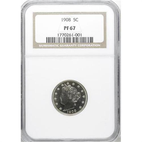 <B>1908 5C PR67 NGC.</B></I> Sharply struck and gleaming, a delightful Superb Gem exemplar that offers incredible visual appeal. Minimally toned and impressive for this nearly century-old issue. Census: 22 in 67, 2 finer (11/07).<BR><BR><B>Coin Engraver:</B> Charles E. Barber<BR><BR><b>Shipping:</b> Coins & Currency (<a target="_blank" href="http://www.heritageauctions.com/common/shipping.php">view shipping information</a>)