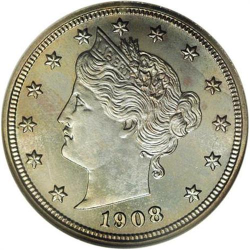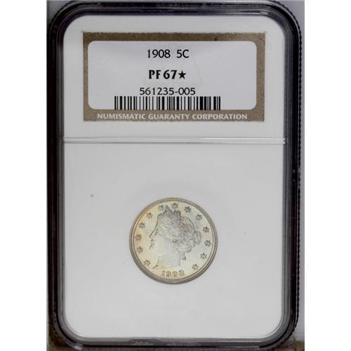 <B>1908<5C> PR67 <img border='0' src='http://www.heritagecoins.com/images/star.gif' width=10 height=10> NGC.</B></I> Essentially brilliant obverse and reverse surfaces with hints of peripheral gold toning. Although designated as a <img border='0' src='http://www.heritagecoins.com/images/star.gif' width=10 height=10> coin by NGC, they failed to mention the Cameo contrast that still exists. The devices have moderate luster, and they are surrounded by deeply mirrored fields. Census: 19 in 67 Cameo, 2 finer (3/06). <BR><BR><B>Important notice:</B> Heritage usually auctions material at the rate of 200-250 lots per hour. On some occasions eBay Live bid software or the Internet may not be able to keep up with the pace of the auction. We recommend placing a realistic absentee bid now as insurance to avoid disappointment. Occasionally the auctioneer may eliminate or reject an eBay Live bid, and the auctioneer may also reopen a lot after the close of the eBay live bidding (usually because we missed an audience bid), and may reject your bid even if it shows you as the winning bidder. By bidding via eBay Live, you agree that Heritage may award the lot to another bidder at its sole discretion under the circumstances described above or any other reasonable circumstances. Since eBay bids are not shown to us until we open the lot on the floor, we treat those bids just like floor bids. In most cases the floor responds before the eBay bid is presented to us, due to Internet lag time, so for consistency we have made it a policy that floor bids are always considered first over tie eBay live bids. Also please note that all Heritage lots purchased through eBay Live carry a 20% Buyer's Premium. Please make sure you read the Terms and Conditions before you bid. This lot is being auctioned in conjunction with a live floor auction by Heritage Galleries & Auctioneers. All final auction and invoice information will be supplied by Heritage Galleries & Auctioneers, and all other information should be considered preliminary. Lot:1018 <BR><BR><B>Winning Notification and Billing:</B> After the FINAL session in this auction is complete, Heritage will send e-mail and snail mail invoices. This process normally takes several days. All final auction and invoice information will be supplied by Heritage Galleries & Auctioneers, and all other information should be considered preliminary. <BR><BR>This auction will be conducted on a live auction floor and over the Internet through eBay Live. If you choose to place an absentee bid, please take a moment to <font color='#0000ff'><u><a href='http://pages.ebay.com/liveauctions/help/before/laabsentee.html'>learn how eBay Live absentee bidding works</a></u></font><font color='#000000'>