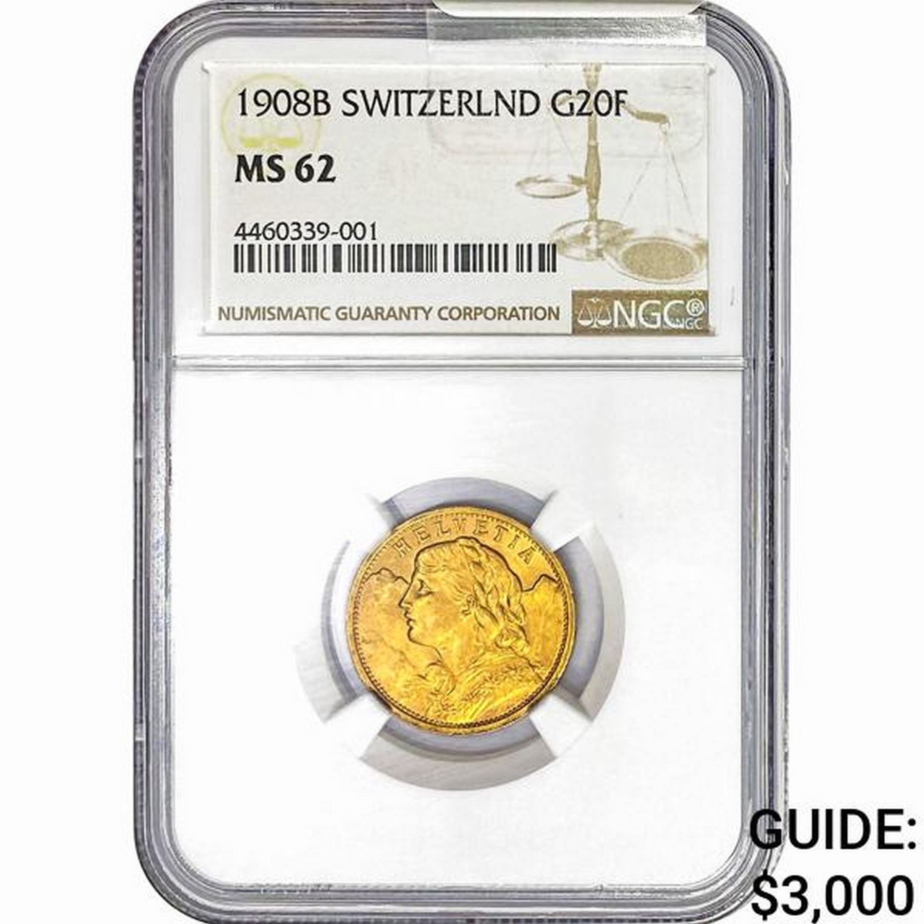 1908 B Switzerland .186oz Gold 20 Francs NGC MS62