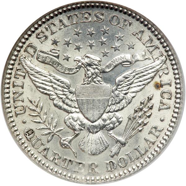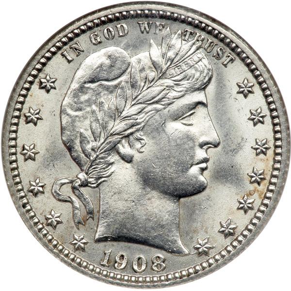 1908 Barber Quarter Dollar. NGC graded MS-62. A nice untoned coin.