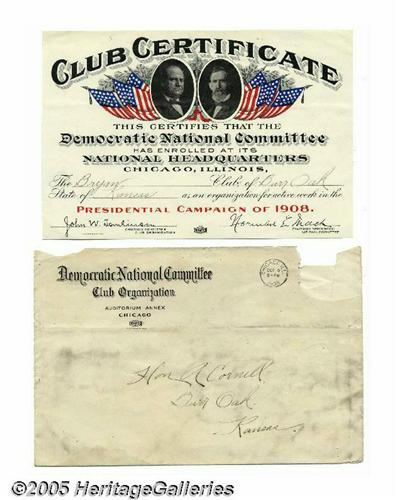<B>1908 Bryan Club Certificate - Bryan / Kern Jugate</B></I> William Jennings Bryan was three times a presidential candidate and 1908 was his last race. Here is an excellent item from that campaign. It is a Club Certificate certifying, "that the Democratic National Committee has enrolled at its National Headquarters Chicago, Illinois The <I>Bryan</B></I> Club, of <I>Bur Oak</B></I> State of Kansas as an organization for active work in the Presidential Campaign of 1908." It has jugate oval portraits of Bryan and John W. Kern surrounded by American flags. Very colorful, 9" x 6" in size and in near mint condition. Original mailing envelope is included from the DNC addressed to the club president (stamp removed). Lot:260