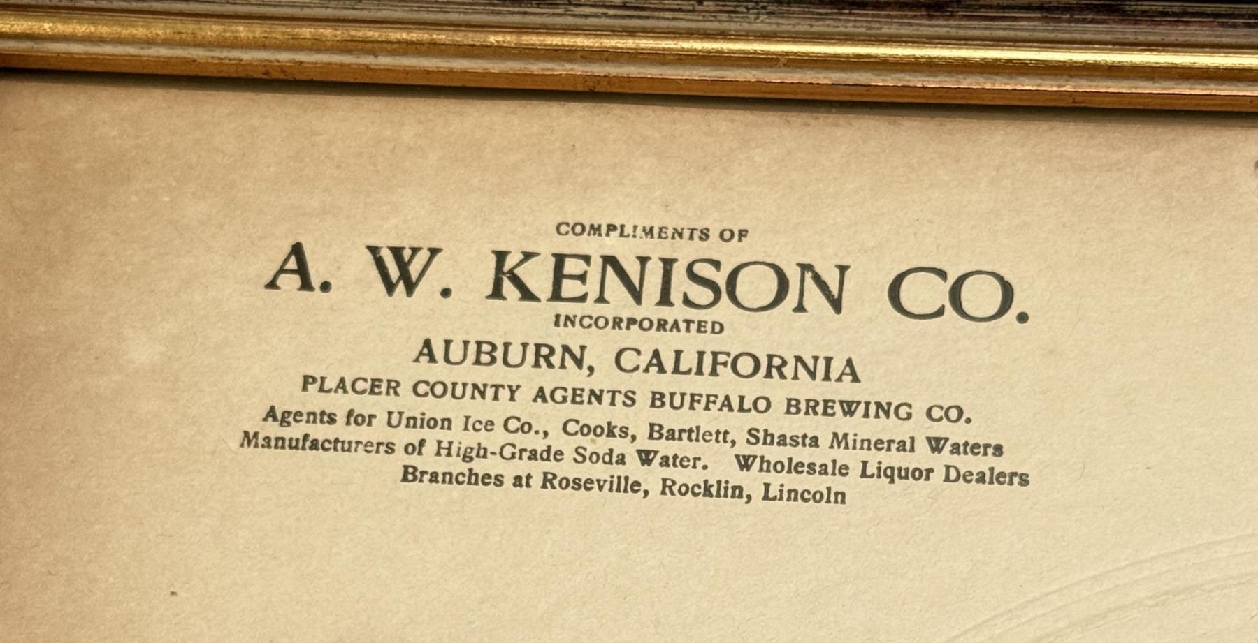 A.W. Kenison Auburn California, Placer County Agents Buffalo Brewing Co. 16 1/2" by 21 1/2" framed.