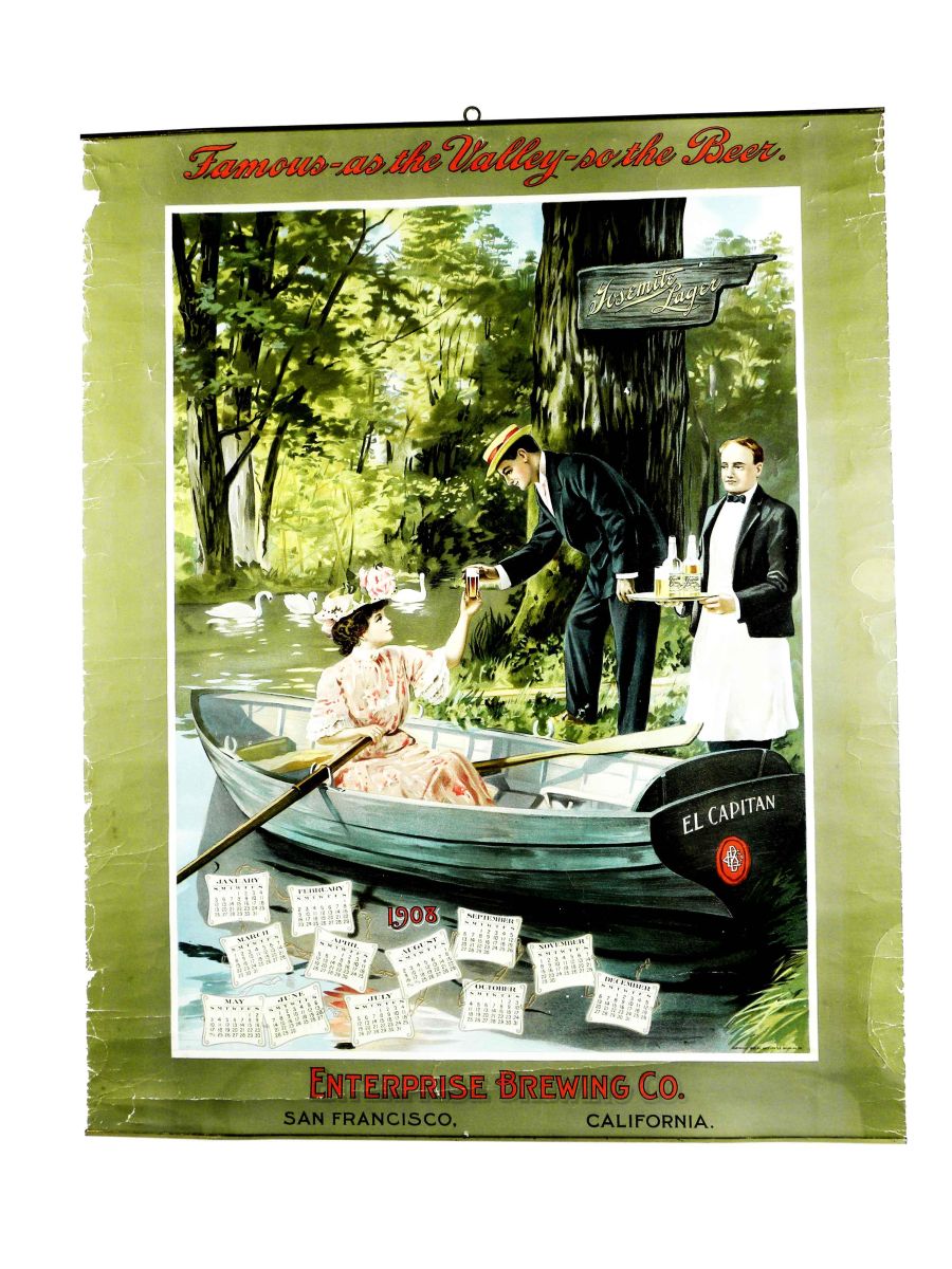1908 Calendar for Yosemite Lager. Enterprise Brewing Company Co. San Francisco, CA. Original bands top and bottom. Edge ware around perimeter with paper loss on left side and horizontal wrinkles otherwise good condition. 22 X 28 inches image only.
