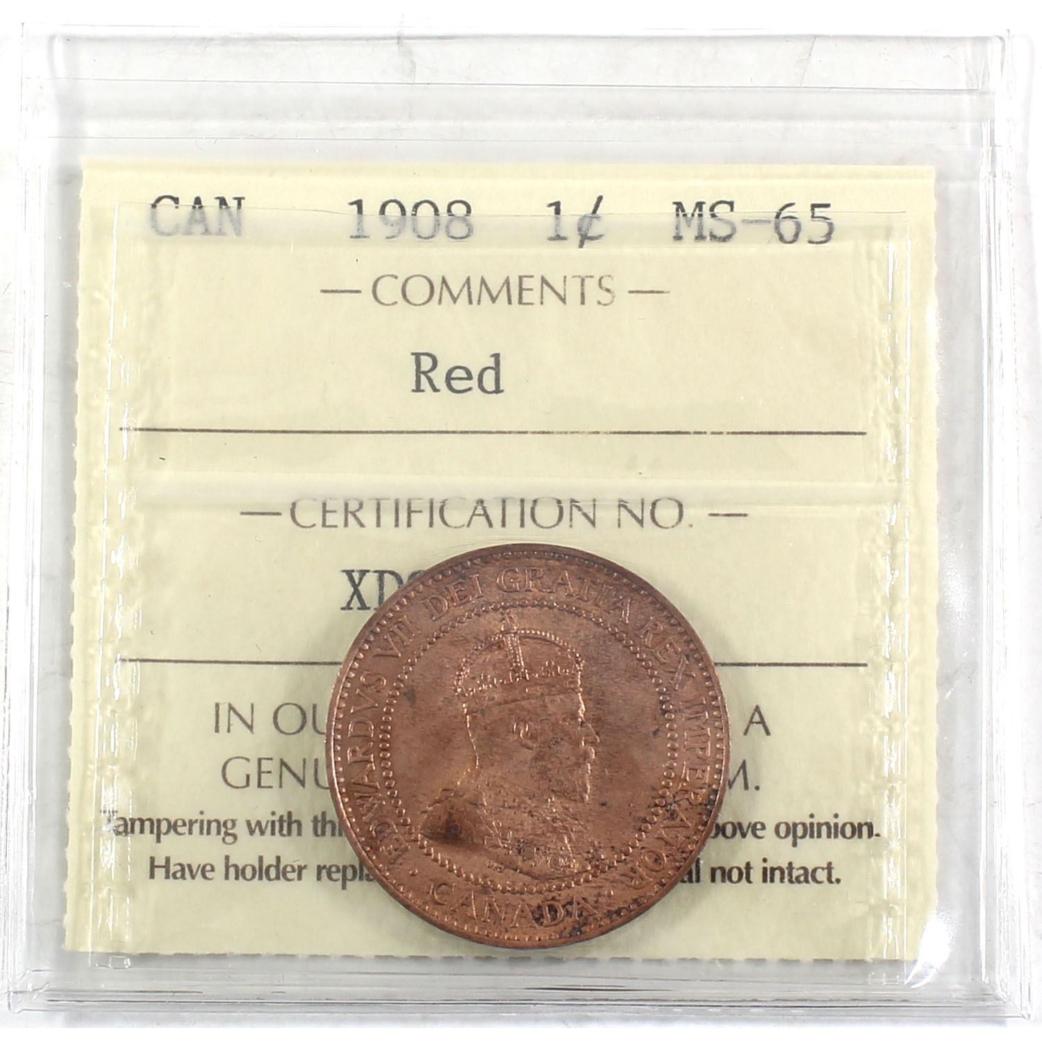 1908 Canada 1-cent ICCS Certified MS-65 Red