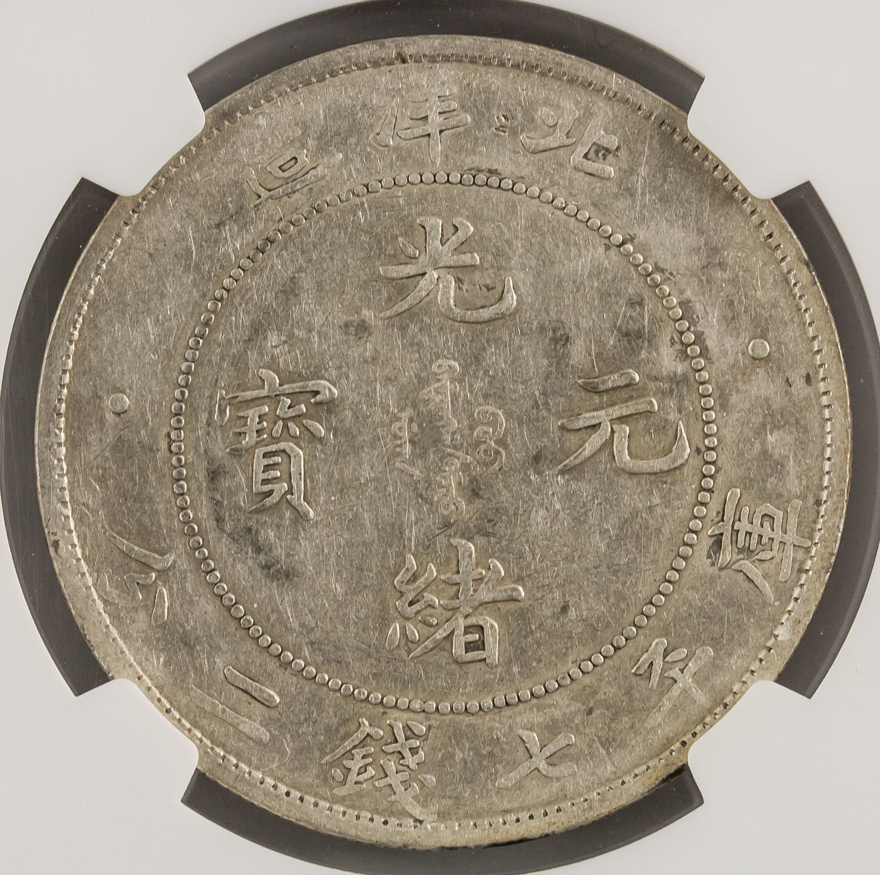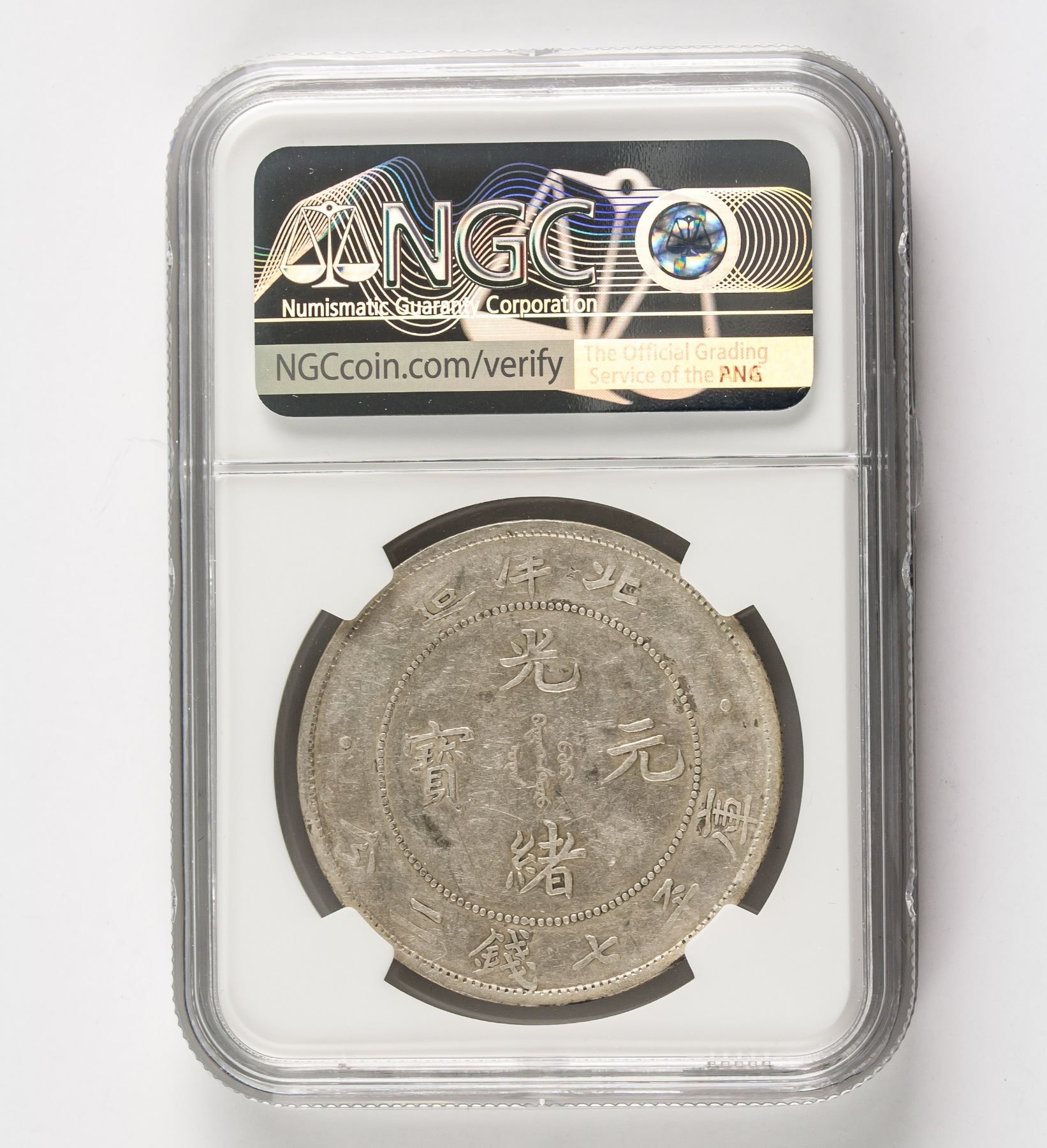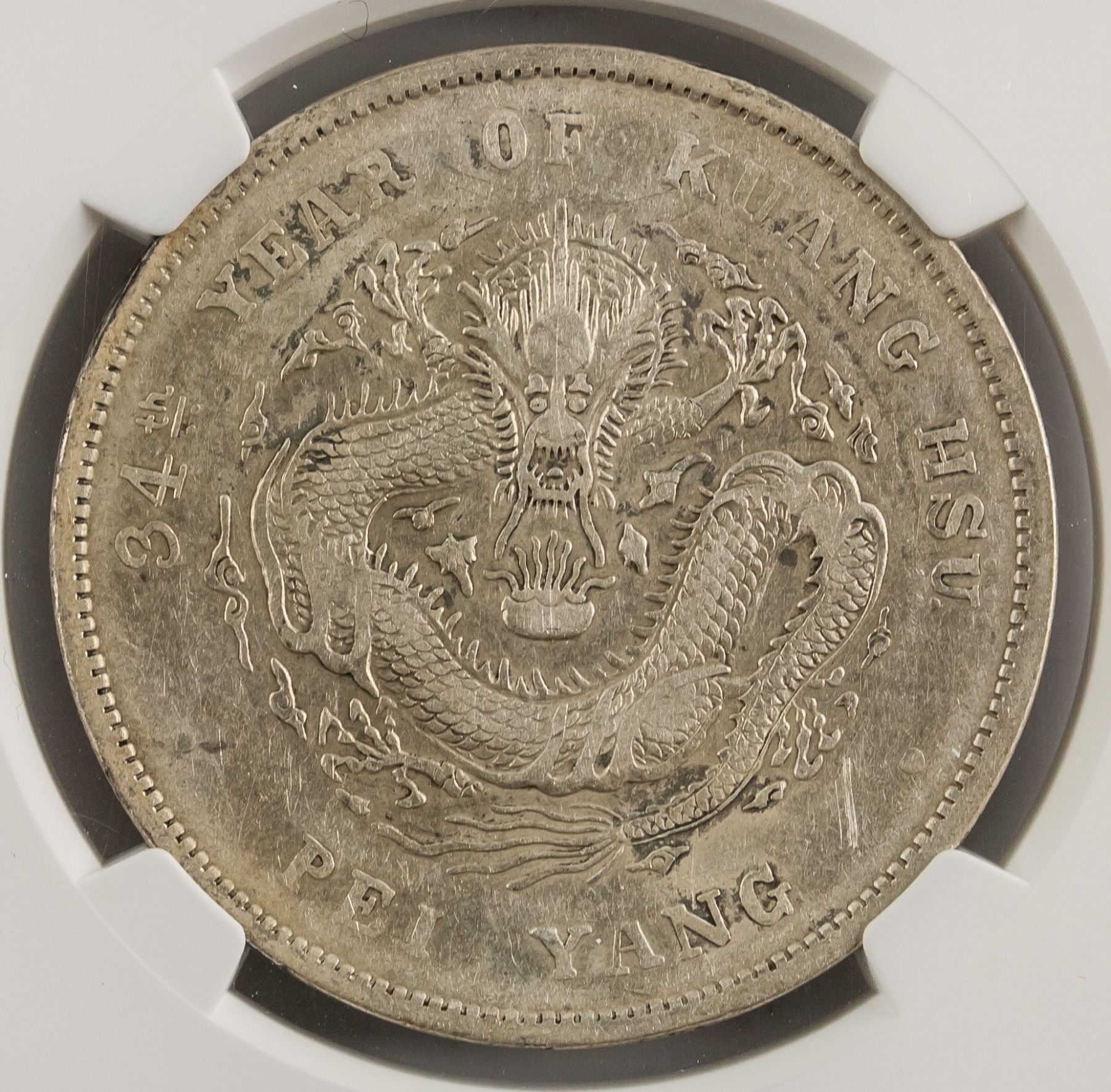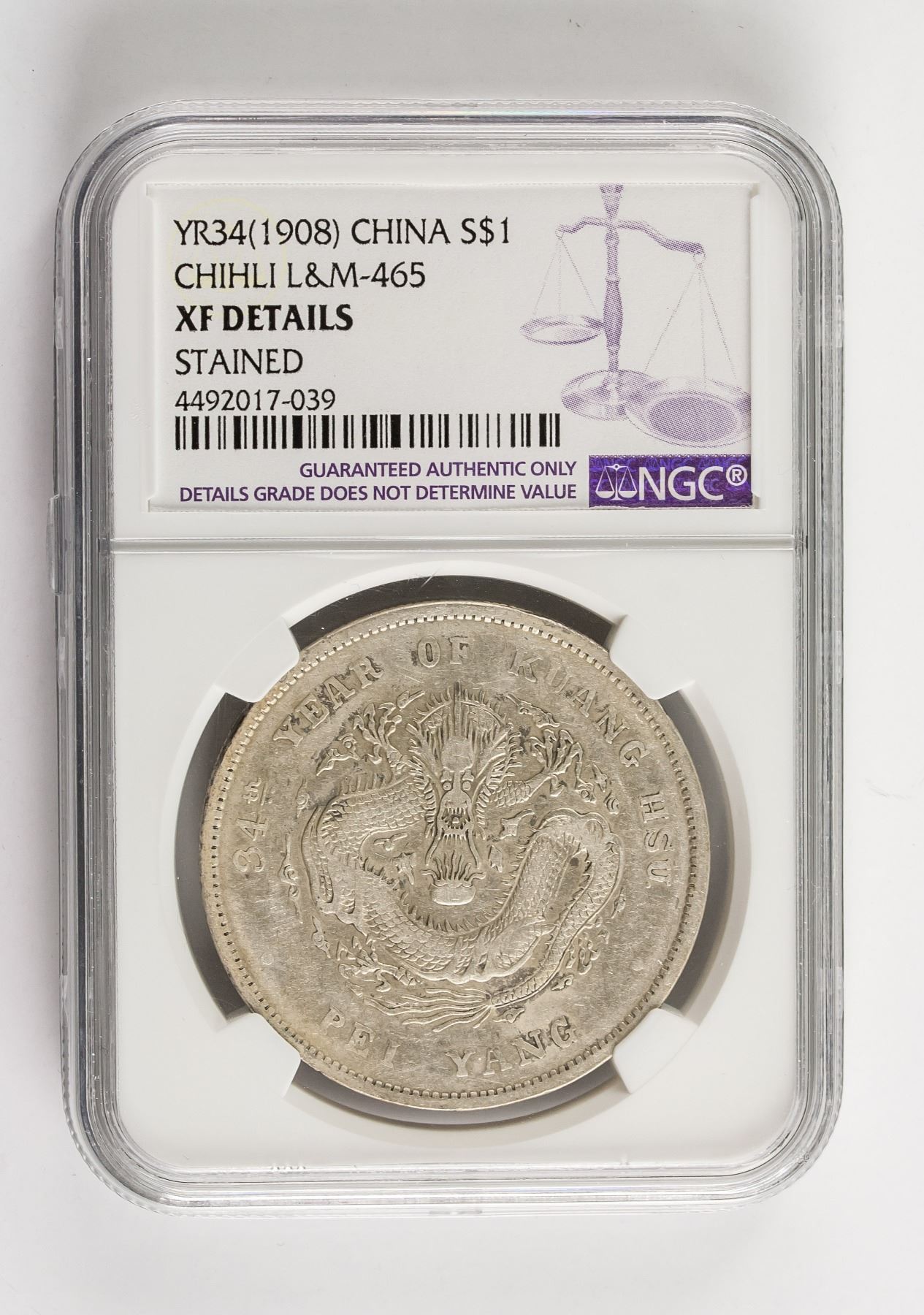Chinese 1908 Qing dynasty Guangxu 1 Dollar silver coin; Chili Peiyang mint; obverse lettering Guang Xu Yuan Bao, Bei Yang Zao, Ku Ping Qi Qian Er Fen; reverse engraved dragon, lettering 34th YEAR OF KUANG HSU, PEI YANG; NGC graded L&M-465 XF Details, stained; serial number 4492017-039