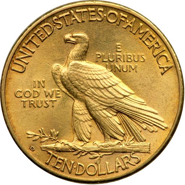 1908-D $10 Indian. With motto. PCGS graded AU-58. Light golden toning (PCGS # 8860) .