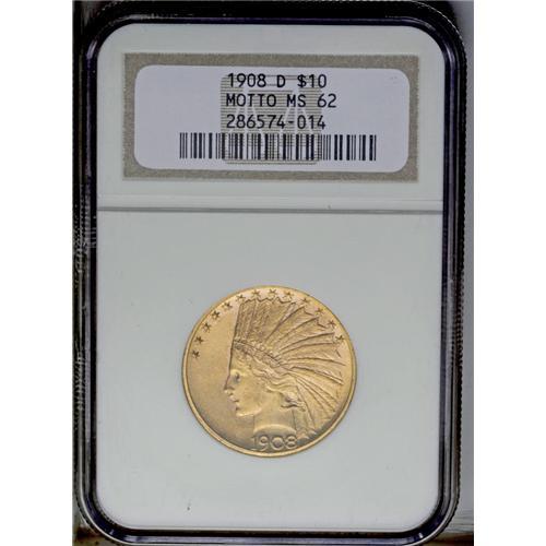 <B>1908-D<$10> Motto MS62 NGC.</B></I> Subtle violet accents appear in the protected areas of the solidly struck devices. The yellow-gold surfaces have pleasing luster, though several marks are noted, including an abrasion on the jawline.<BR><I>From The Clifton Rodenburg Collection.</B></I>