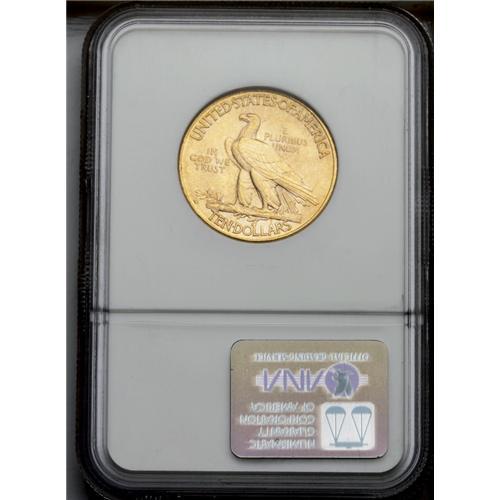 1908-D $10 Motto MS62 NGC. Subtle violet accents appea