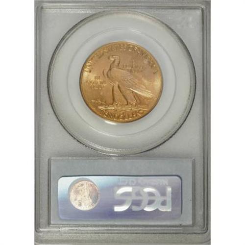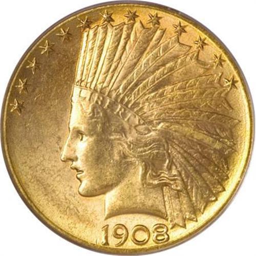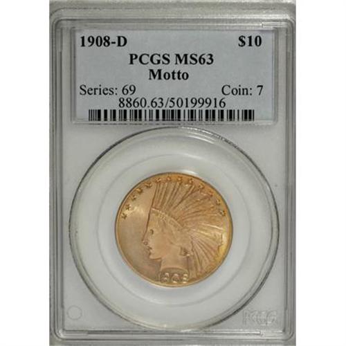 <B>1908-D $10 Motto MS63 PCGS.</B></I> Delectable reddish-gold and green-gold patches alternate on this lovely coin. Although more than 800,000 pieces were produced, Gems are rare. Even in MS63, PCGS has certified only 50 examples, with 30 coins finer (3/08). The present piece boasts boldly struck, lustrous surfaces with radiant luster and only a few scattered ticks that constitute the grade.<BR><BR><B>Coin Engraver:</B> Augustus Saint-Gaudens<BR><BR><b>Shipping:</b> Coins & Currency (<a target="_blank" href="http://www.heritageauctions.com/common/shipping.php">view shipping information</a>)