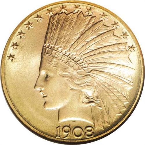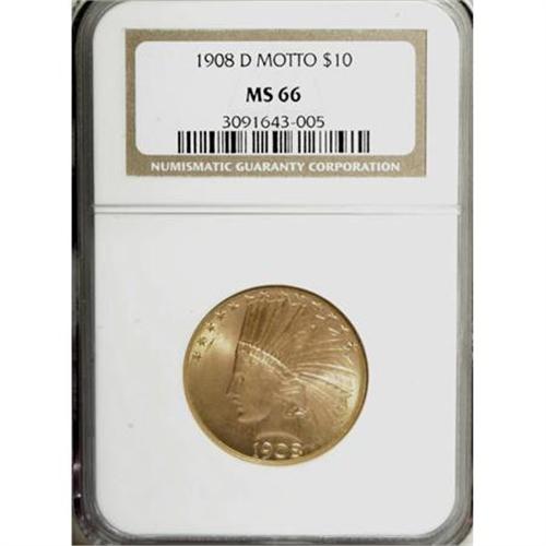 <B>1908-D $10 Motto MS66 NGC.</B></I> With its ample mintage of 836,500 pieces, the 1908-D Motto eagle seems as if it should be an available issue, and through the circulated grades, this holds true, as even Choice AU examples command little to no premium above type. Mint State examples, however, prove surprisingly elusive, a fact that was not acknowledged for several decades. As late as 1980, David Akers, in his seminal volume on ten dollar gold pieces, described the 1908-D Motto as "one of the most underrated dates of the Indian Head type."<BR> The market for this issue has shifted since then, and the 1908-D has taken its place among the condition rarities of the series for knowledgeable enthusiasts. Awareness of the 1908-D Motto ten, however, has come only gradually to the numismatic population at large, which perpetuates a remarkable opportunity for the discerning collector. Garrett and Guth (2006) write that "[f]or the serious and well-heeled specialist, this date can be obtained," but " ... few examples survived that have the unblemished surfaces required" for an MS65 or better designation.<BR> This gorgeous Premium Gem should find a home with a numismatist possessing those qualities. Its wheat-gold surfaces are strongly lustrous with the subtle granularity common to all high-end representatives, and while the strike is a trifle soft at the highpoints of the portrait, the overall level of definition is bold. The fields and devices are as well-preserved as one could want for the grade, and if not for a handful of tiny flaws, it would have a legitimate claim to Superb Gem status. In sum, a marvelous example. Census: 5 in 66, 4 finer (11/07).<BR><BR><B>Coin Engraver:</B> Augustus Saint-Gaudens<BR><BR><b>Shipping:</b> Coins & Currency (<a target="_blank" href="http://www.heritageauctions.com/common/shipping.php">view shipping information</a>)