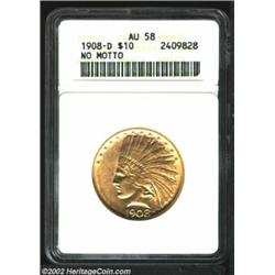 1908-D $10 No Motto AU58 ANACS. The Indian's cheekbone has a hint of rub, and the truncation of the bust has a pair of minor abrasions. A bold representative that has nearly complete luster. Unlike later issues, the mintmark is located well above the left edge of the olive branch. Important notice: We expect to be auctioning lots at the rate of 200-250 per hour. Sometimes eBay Premier live bid software cannot keep up with that pace, so we strongly recommend that you place a realistic proxy bid now as insurance to avoid disappointment. Also please note that all Heritage/CAA lots purchased through eBay Premier carry a 20% Buyer's Premium. Please make sure you read the Terms and Conditions.
