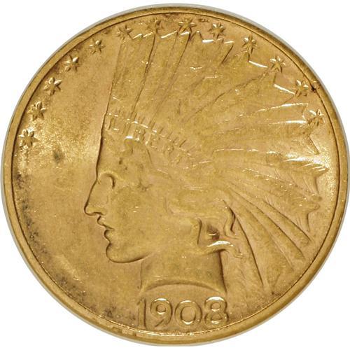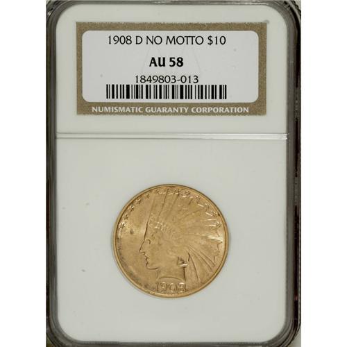 <B>1908-D $10 No Motto AU58 NGC.</B></I> NGC Census: (184/314). PCGS Population (150/303). Mintage: 210,000. Numismedia Wsl. Price for NGC/PCGS coin in AU58: $500. (#8854)<BR><BR><b>Shipping:</b> Coins & Currency (<a target="_blank" href="http://www.heritageauctions.com/common/shipping.php">view shipping information</a>)