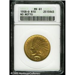 <B>1908-D $10 No Motto MS61 ANACS.</B></I> Fully lustrous and brilliant with a more pleasant appearance than one might expect of the grade. Scarcer in Mint State than the mintage would indicate. Lot:8854