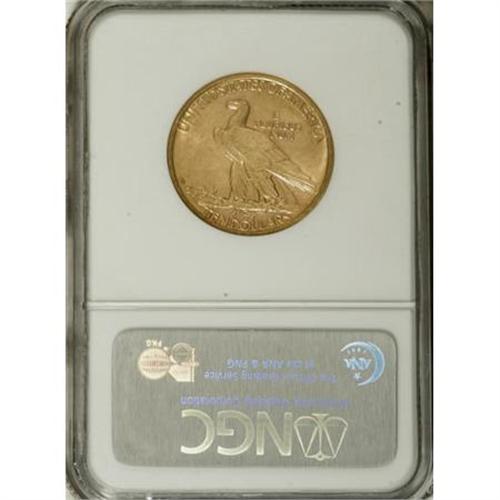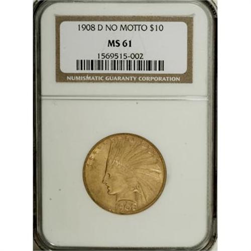 <B>1908-D $10 No Motto MS61 NGC.</B></I> This lower mintage Indian ten has satiny luster and only minor marks on the devices. Straw-gold with infrequent gray hues. The N in UNUM appears to be lightly die doubled.<BR><BR><b>Shipping:</b> Coins & Currency (<a target="_blank" href="http://www.heritageauctions.com/common/shipping.php">view shipping information</a>)