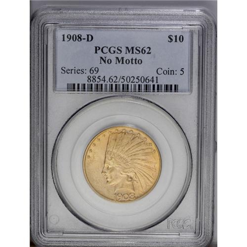 1908-D $10 No Motto MS62 PCGS. A lustrous and lightly