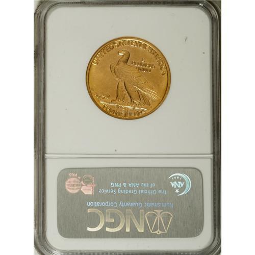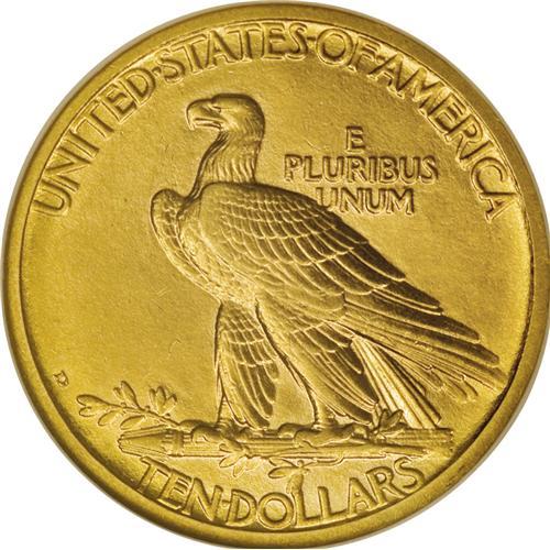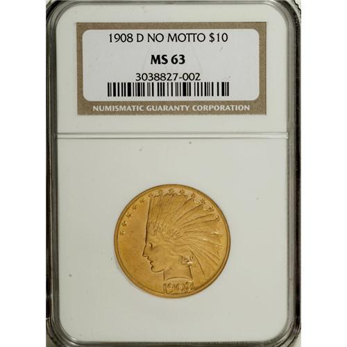 <B>1908-D $10 No Motto MS63 NGC.</B></I> This is a sharply struck Mint State example with deep orange-gold color and fully brilliant satin luster. Slightly lighter gold color is evident on the high points of the obverse and reverse. Jeff Garrett and Ron Guth discuss this issue: "Most of the original mintage did not survive in high grade, and the novelty of the new design had worn off, so few were saved. As a date, this issue does not command the respect it deserves."<BR><BR><b>Shipping:</b> Coins & Currency (<a target="_blank" href="http://www.heritageauctions.com/common/shipping.php">view shipping information</a>)