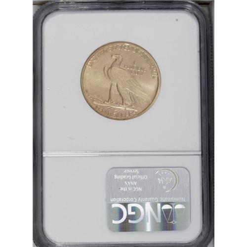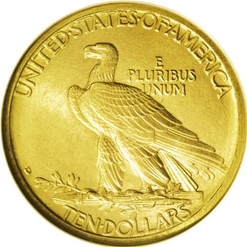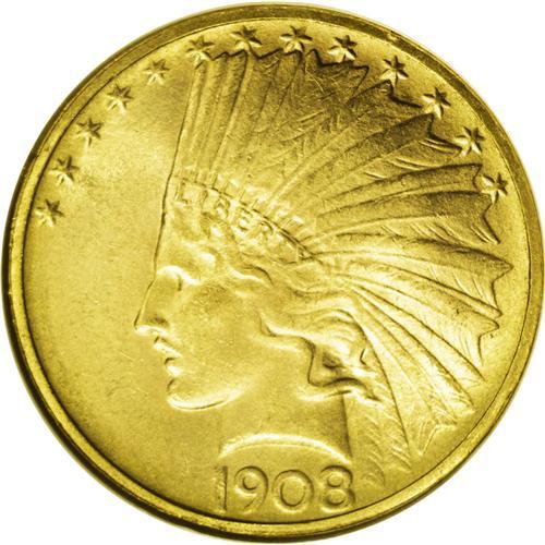 <B>1908-D<$10> No Motto MS64 NGC.</B></I> Jeff Garrett and Ron Guth, in their <I>Encyclopedia of U.S. Gold Coins 1795-1933,</B></I> comment about this issue, "As a date this issue does not command the respect it deserves. One of the probable reasons for the lack of high end coins is the dull luster and weaker strikes so often encountered for this date -- factors required to earn a gem grade by the grading services." And so it is with this coin. The luster is dull, almost matte in quality, and satiny. The strike is on the weak side, particularly on the hair over Liberty's ear. The overall effect, however, is quite appealing, with the soft, satin luster combining with peach-gold color for nice effect. The surfaces are minimally abraded, with the most notable being a mark on Liberty's neck above the 9 in the date.
