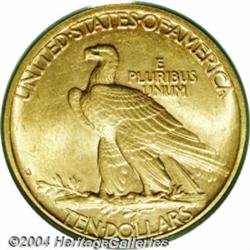 <table><tr><td><table><tr><td>1908-D $10 No Motto MS64 PCGS. A conditionally rare second year issue that is occasionally found in high-end AU grades, including a limited number of Uncirculated pieces that almost always fall into the MS60 to MS62 range. The satiny yellow-gold surfaces on this piece do show the normal softness in the hair curls, but are uncommon in their brightness and vibrancy. Rich reddish-gold color is accented with hints of pastel-blue in the most protected areas. A couple of obverse marks on the figure of the American Indian are all that preclude a full Gem grade. Population: 24 in 64, only 7 are finer (3/04). <BR><BR><B>Important notice:</B> Heritage usually auctions material at the rate of 200-250 lots per hour. On some occasions eBay Live bid software or the Internet may not be able to keep up with the pace of the auction. We recommend placing a realistic absentee bid now as insurance to avoid disappointment. Occasionally the auctioneer may eliminate or reject an eBay Live bid, and the auctioneer may also reopen a lot after the close of the eBay live bidding (usually because we missed an audience bid), and may reject your bid even if it shows you as the winning bidder. By bidding via eBay Live, you agree that Heritage may award the lot to another bidder at its sole discretion under the circumstances described above or any other reasonable circumstances. Since eBay bids are not shown to us until we open the lot on the floor, we treat those bids just like floor bids. In most cases the floor responds before the eBay bid is presented to us, due to Internet lag time, so for consistency we have made it a policy that floor bids are always considered first over tie eBay live bids. Also please note that all Heritage lots purchased through eBay Live carry a 20% Buyer's Premium. Please make sure you read the Terms and Conditions before you bid. <BR><BR><B>IMPORTANT ANNOUNCEMENT ABOUT RESERVES:</B> Heritage now divulges all reserves on its web site 7 days before every auction. If you want to know whether the reserve on this lot has been met, and if not, what the reserve amount is, please visit this lot page on the HeritageCoin.com web site, or email: bid@HeritageGalleries.com </span></font></td></tr></table></td></tr></table>