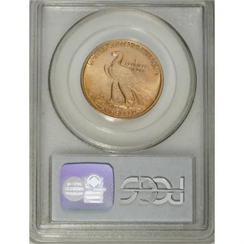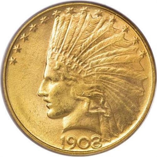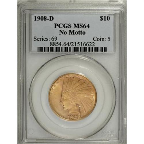 <B>1908-D $10 No Motto MS64 PCGS.</B></I> The 1908-D ten dollar is significant for a few reasons, but perhaps the most notable is the fact that it is the only Denver Mint eagle ever struck without the motto IN GOD WE TRUST on the reverse. President Roosevelt's decision in 1907 to eliminate the motto on the new Saint-Gaudens gold coinage was met with much public disdain. By the end of May 1908 Congress had passed a bill entitled "Public Law No. 120" which called for the restoration of the motto on certain denominations of gold and silver coins of the United States (Burdette, 2006). This is a splendid, high-end example that lacks the marks one would expect from an MS64. The mint luster is thick and frosted with a noticeable trace of red surrounding the reverse margin. Population: 31 in 64, 7 finer (3/08).<BR><BR><B>Coin Engraver:</B> Augustus Saint-Gaudens<BR><BR><b>Shipping:</b> Coins & Currency (<a target="_blank" href="http://www.heritageauctions.com/common/shipping.php">view shipping information</a>)