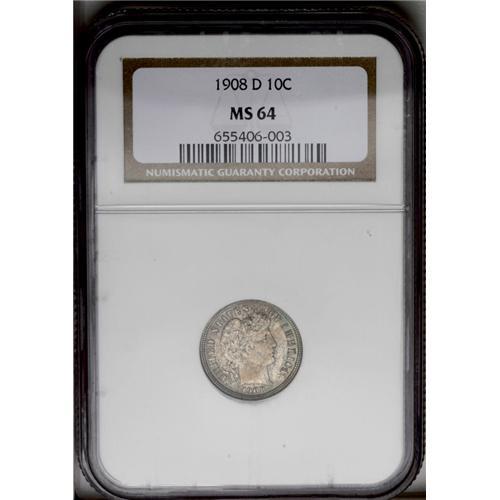 1908-D 10C MS64 NGC. Dusky gray-brown and iridescent t 1908-D[10C] MS64 NGC.