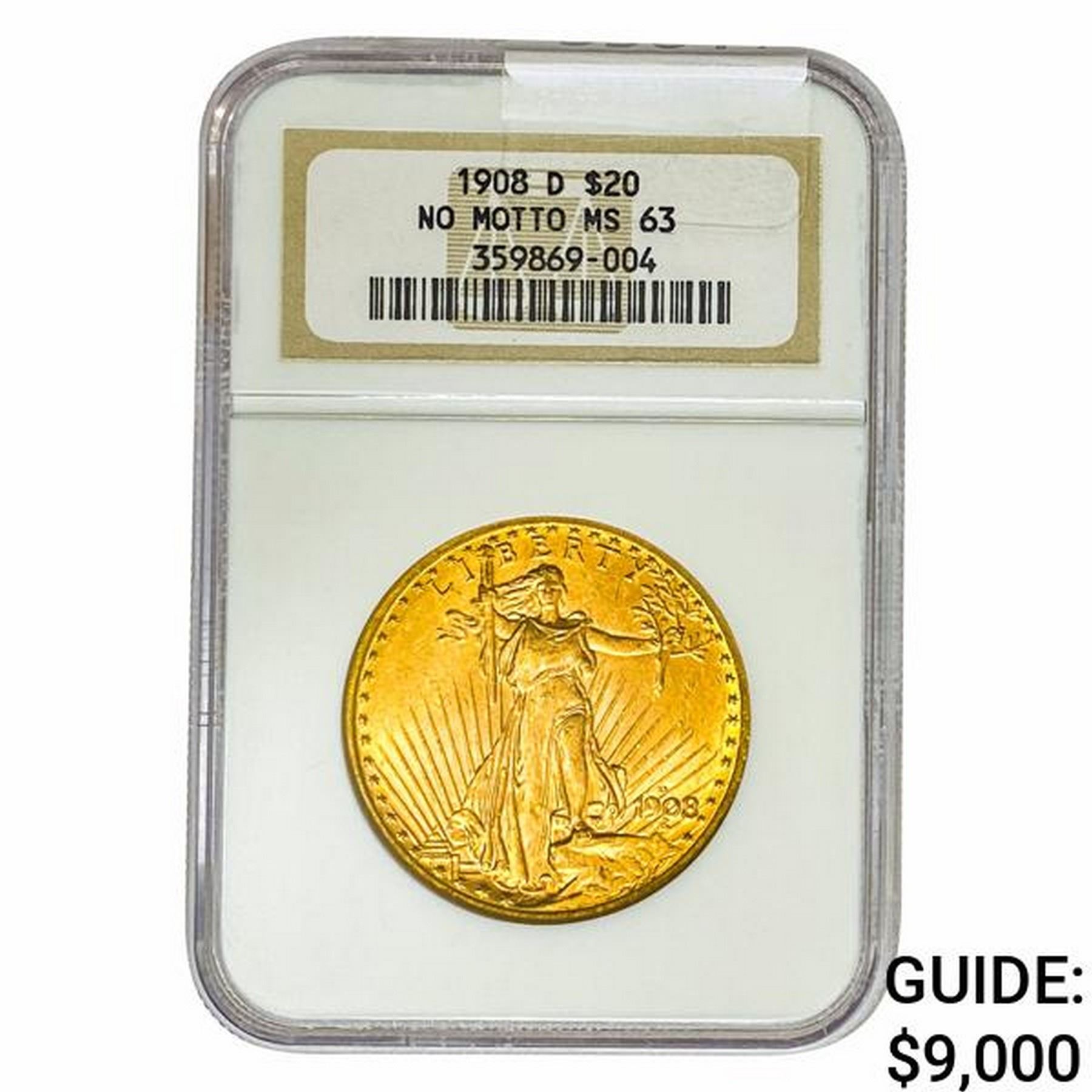 1908-D $20 Gold Double Eagle NGC MS63 No Motto