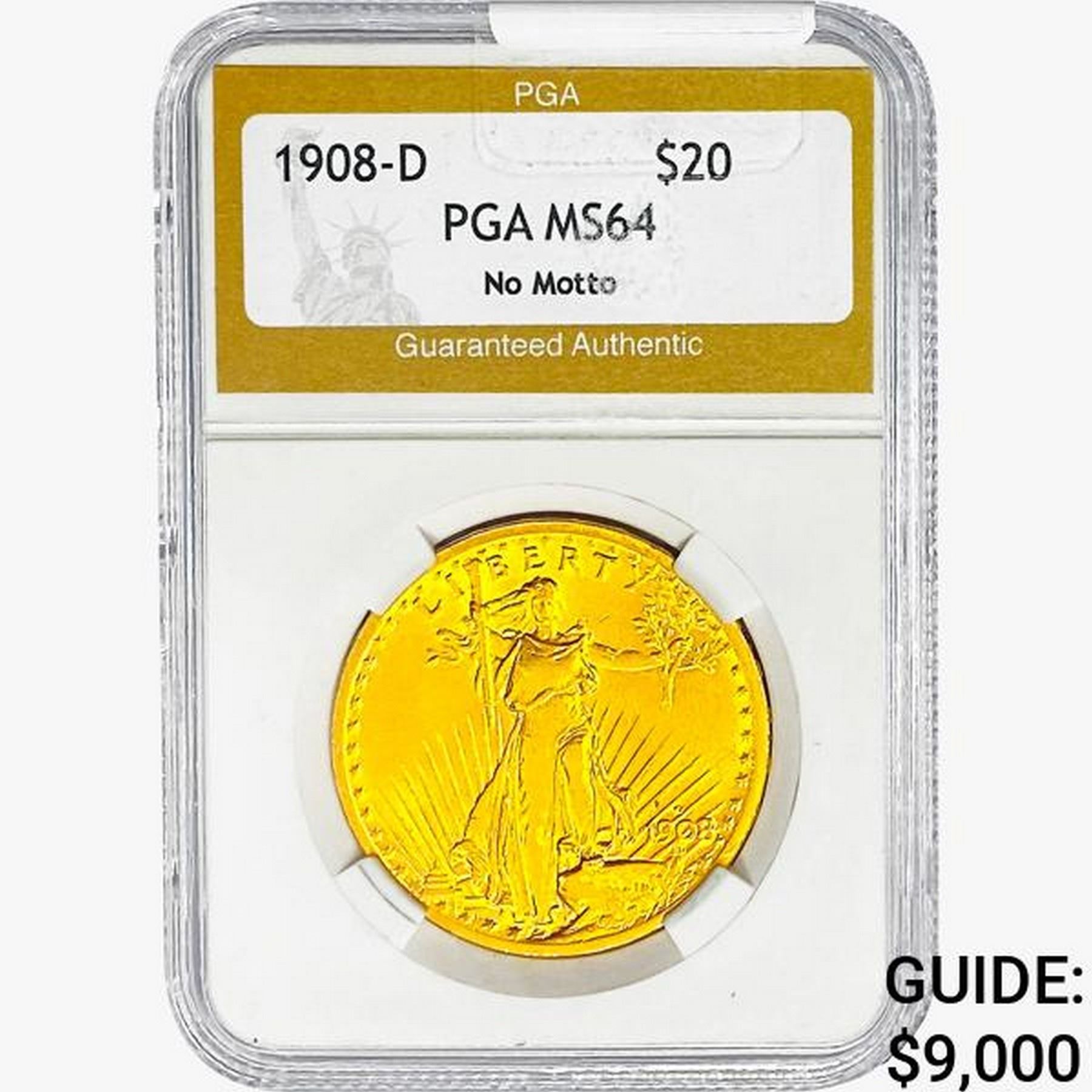 1908-D $20 Gold Double Eagle PGA MS64 NO MOTTO