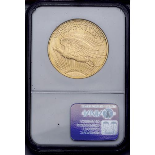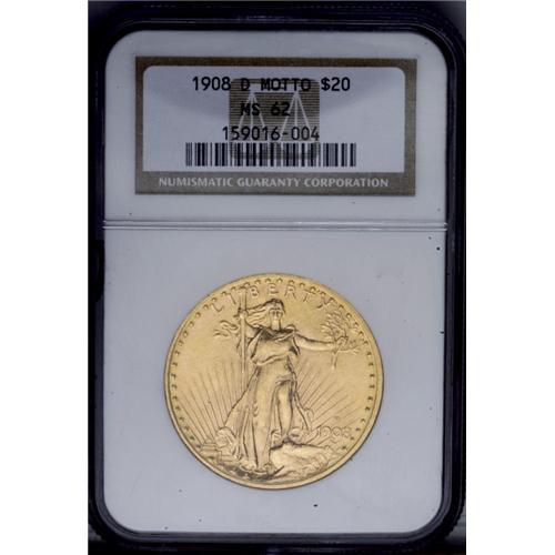 <B>1908-D<$20> Motto MS62 NGC.</B></I> Very attractive and well defined with softly frosted luster, matte-like surfaces, and a relatively small number of trivial blemishes for the grade.<BR><I>From The Steve Glenn Collection.</B></I> <BR><BR><B>Important notice:</B> Heritage usually auctions material at the rate of 200-250 lots per hour. On some occasions eBay Live bid software or the Internet may not be able to keep up with the pace of the auction. We recommend placing a realistic absentee bid now as insurance to avoid disappointment. Occasionally the auctioneer may eliminate or reject an eBay Live bid, and the auctioneer may also reopen a lot after the close of the eBay live bidding (usually because we missed an audience bid), and may reject your bid even if it shows you as the winning bidder. By bidding via eBay Live, you agree that Heritage may award the lot to another bidder at its sole discretion under the circumstances described above or any other reasonable circumstances. Since eBay bids are not shown to us until we open the lot on the floor, we treat those bids just like floor bids. In most cases the floor responds before the eBay bid is presented to us, due to Internet lag time, so for consistency we have made it a policy that floor bids are always considered first over tie eBay live bids. Also please note that all Heritage lots purchased through eBay Live carry a 20% Buyer's Premium. Please make sure you read the Terms and Conditions before you bid. This lot is being auctioned in conjunction with a live floor auction by Heritage Galleries & Auctioneers. All final auction and invoice information will be supplied by Heritage Galleries & Auctioneers, and all other information should be considered preliminary. Lot:4565 <BR><BR><B>Winning Notification and Billing:</B> After the FINAL session in this auction is complete, Heritage will send e-mail and snail mail invoices. This process normally takes several days. All final auction and invoice information will be supplied by Heritage Galleries & Auctioneers, and all other information should be considered preliminary. <BR><BR>This auction will be conducted on a live auction floor and over the Internet through eBay Live. If you choose to place an absentee bid, please take a moment to <font color='#0000ff'><u><a href='http://pages.ebay.com/liveauctions/help/before/laabsentee.html'>learn how eBay Live absentee bidding works</a></u></font><font color='#000000'>