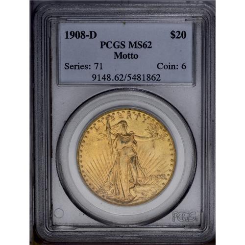 <B>1908-D<$20> Motto MS62 PCGS.</B></I> Dark on the highpoints with rose, orange, and yellow-gold hues on both sides. Light marks scatter the surfaces, but none appear to be individually bothersome.<BR><I>From The Steve Glenn Collection.</B></I> <BR><BR><B>Important notice:</B> Heritage usually auctions material at the rate of 200-250 lots per hour. On some occasions eBay Live bid software or the Internet may not be able to keep up with the pace of the auction. We recommend placing a realistic absentee bid now as insurance to avoid disappointment. Occasionally the auctioneer may eliminate or reject an eBay Live bid, and the auctioneer may also reopen a lot after the close of the eBay live bidding (usually because we missed an audience bid), and may reject your bid even if it shows you as the winning bidder. By bidding via eBay Live, you agree that Heritage may award the lot to another bidder at its sole discretion under the circumstances described above or any other reasonable circumstances. Since eBay bids are not shown to us until we open the lot on the floor, we treat those bids just like floor bids. In most cases the floor responds before the eBay bid is presented to us, due to Internet lag time, so for consistency we have made it a policy that floor bids are always considered first over tie eBay live bids. Also please note that all Heritage lots purchased through eBay Live carry a 20% Buyer's Premium. Please make sure you read the Terms and Conditions before you bid. This lot is being auctioned in conjunction with a live floor auction by Heritage Galleries & Auctioneers. All final auction and invoice information will be supplied by Heritage Galleries & Auctioneers, and all other information should be considered preliminary. Lot:4566 <BR><BR><B>Winning Notification and Billing:</B> After the FINAL session in this auction is complete, Heritage will send e-mail and snail mail invoices. This process normally takes several days. All final auction and invoice information will be supplied by Heritage Galleries & Auctioneers, and all other information should be considered preliminary. <BR><BR>This auction will be conducted on a live auction floor and over the Internet through eBay Live. If you choose to place an absentee bid, please take a moment to <font color='#0000ff'><u><a href='http://pages.ebay.com/liveauctions/help/before/laabsentee.html'>learn how eBay Live absentee bidding works</a></u></font><font color='#000000'>