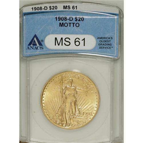 1908-D $20 Motto MS61 ANACS. NGC Census: (141/1460